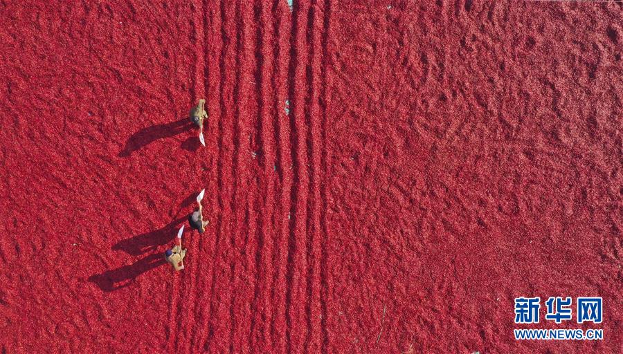 1月3日,河北省玉田县亮甲店镇黄林村农民在场院晾晒辣椒(无人机照片)。新华社发(刘满仓 摄)