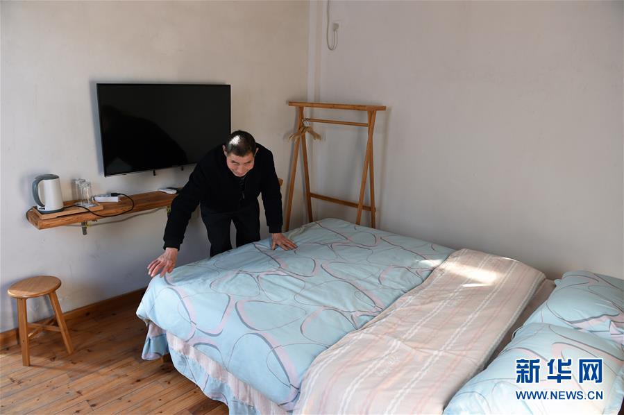 安徽省金寨县大湾村村民陈泽申在自己的新家中整理床铺。这个房间被他改造为旅游民宿,可提供给游客居住(2019年12月29日摄)。新华社发(周牧 摄)