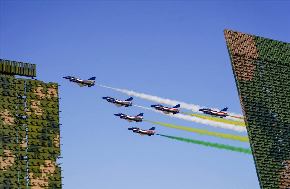 ↑2019年10月21日,在吉林长春举行的庆祝人民空军成立70周年航空开放活动上,空军八一飞行表演队歼-10飞机编队从静态展示的新型雷达上空飞过。新华社发(万全摄)