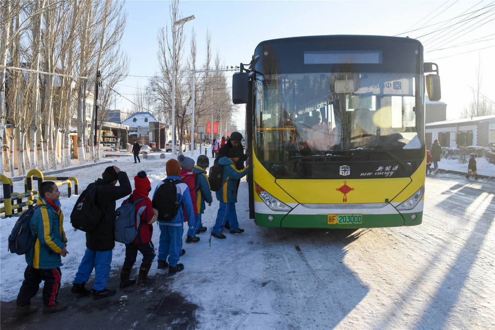 ↑2019年12月18日,在新疆伊犁哈萨克自治州察布查尔锡伯自治县海努克乡阿热吾斯塘村小学,学生排队登上“校车专线”。新华社记者丁磊摄
