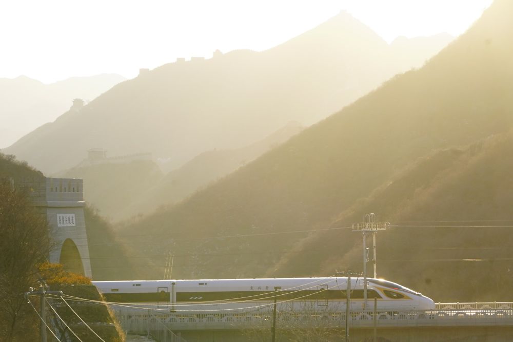 ↑2019年12月30日,G2418次列车驶过居庸关长城。当日,北京至张家口高速铁路开通运营,崇礼铁路同步通车。新华社记者邢广利摄
