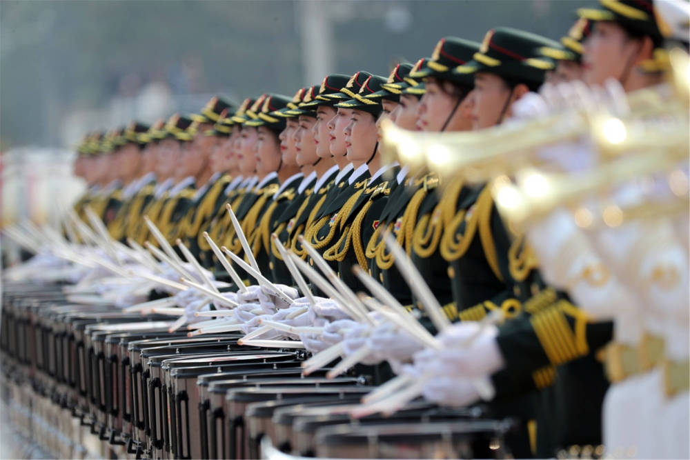 ↑2019年10月1日,庆祝中华人民共和国成立70周年大会在北京天安门广场隆重举行。这是联合军乐团在演奏。新华社记者姚大伟摄