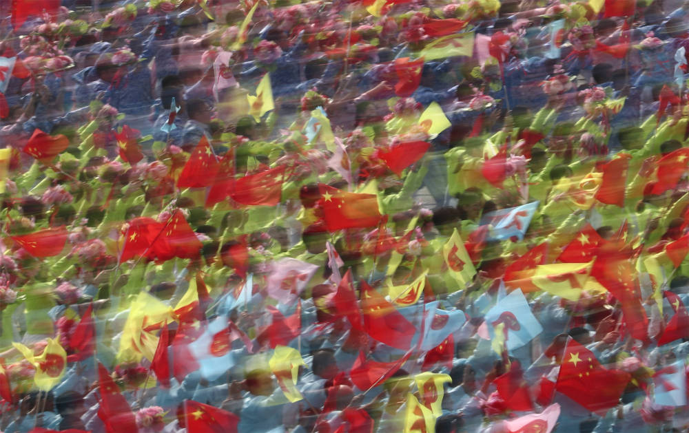 ↑2019年10月1日,庆祝中华人民共和国成立70周年大会在北京天安门广场隆重举行。这是行进中的群众游行方阵。新华社记者兰红光摄