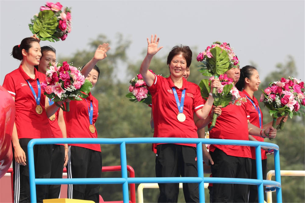 ↑2019年10月1日,庆祝中华人民共和国成立70周年大会在北京天安门广场隆重举行。这是中国女排亮相“祖国万岁”彩车。新华社记者欧东衢摄