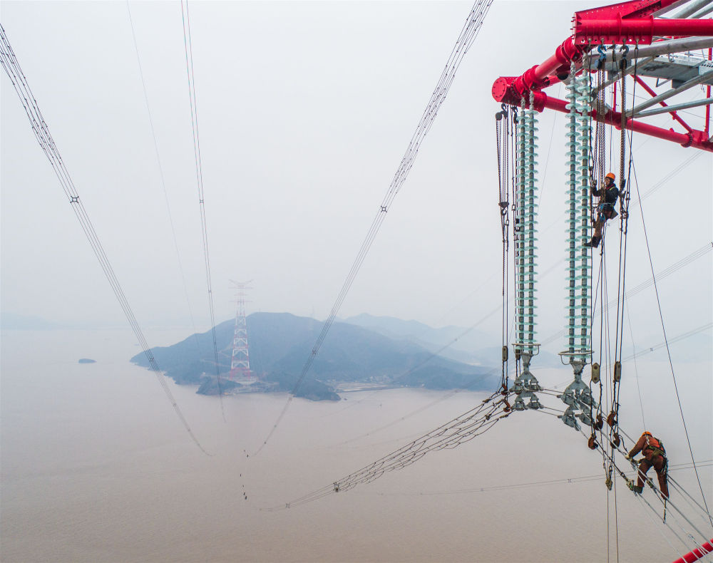 ↑2019年1月3日,施工人员在浙江省舟山500千伏联网输变电工程380米跨海输电铁塔上进行验收和消缺作业(无人机照片)。新华社记者徐昱摄