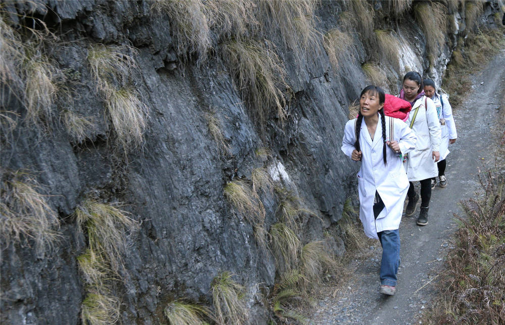 ↑2019年1月13日,在云南省贡山县丙中洛镇,管延萍(左)与同事走在进村的山路上。管延萍从经济发达的珠三角地区,自愿到深度贫困地区云南怒江傈僳族自治州参加东西部扶贫协作,并主动申请将期限从半年延长至3年。 新华社记者张加扬摄