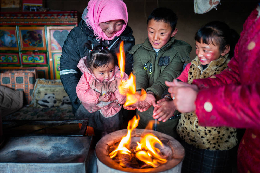↑2019年1月17日,西藏班戈县尼玛乡牧民齐美一家在冬季牧民定居点烤火。新华社记者普布扎西摄
