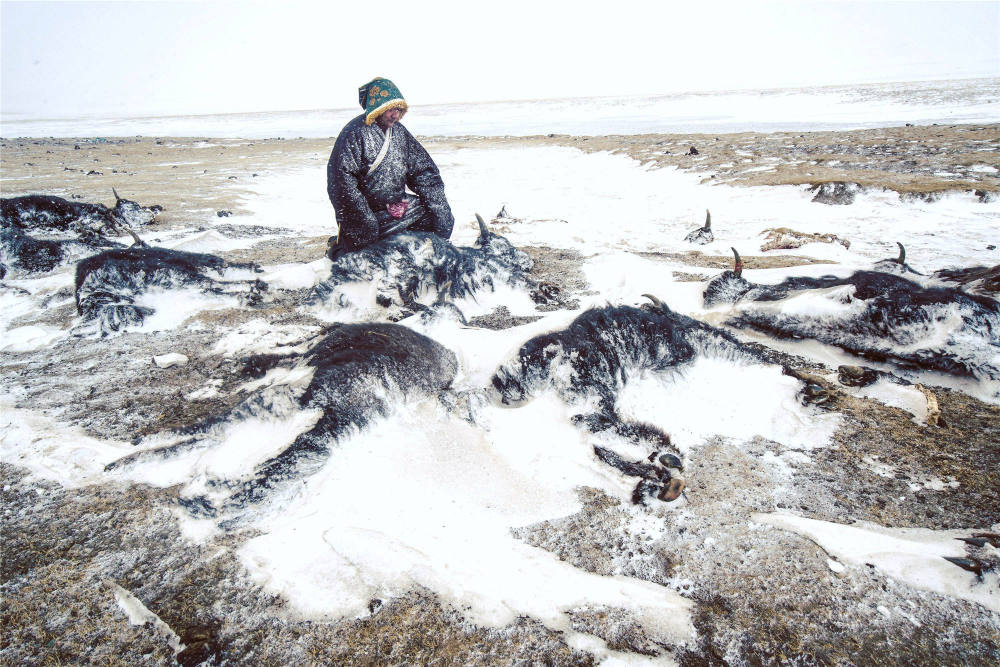 ↑2019年2月23日,青海省玉树藏族自治州称多县扎朵镇治多村牧民坐在自家被冻死的牦牛前。2018年12月下旬以来,玉树州境内多次大范围降雪,部分地区遭受重度、特重度雪灾。 新华社记者吴刚摄