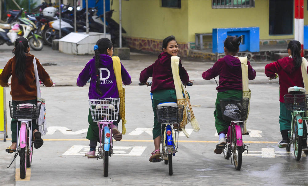 ↑2019年3月8日,在云南省瑞丽市姐相乡银井村,银井小学几名缅籍学生骑车回家,跨过银井边防口岸国境线。每天清晨,都有一群孩子通过银井边防站,从缅甸来到瑞丽市银井小学读书。新华社记者李晓果摄