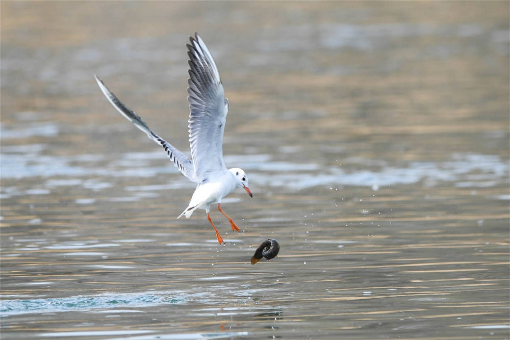 ↑2019年3月17日,水鸟在山西省太原市汾河湿地公园觅食。新华社记者杨晨光摄