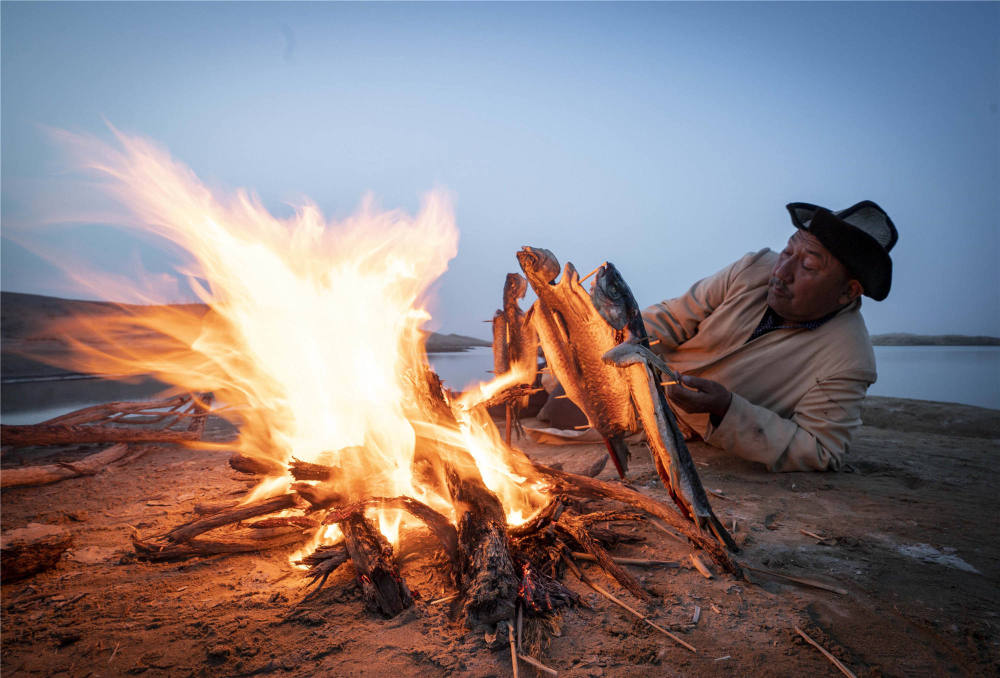 ↑2019年4月11日,在新疆尉犁县罗布人村寨里,罗布人阿木东·艾不东在塔里木河畔烤鱼。新华社记者赵戈摄