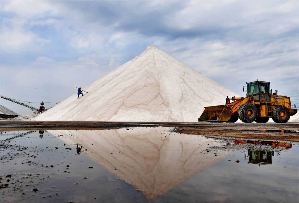 ↑2019年7月3日,河北唐山海港经济开发区大清河盐场的工人在洗盐场工作。新华社记者杨世尧摄