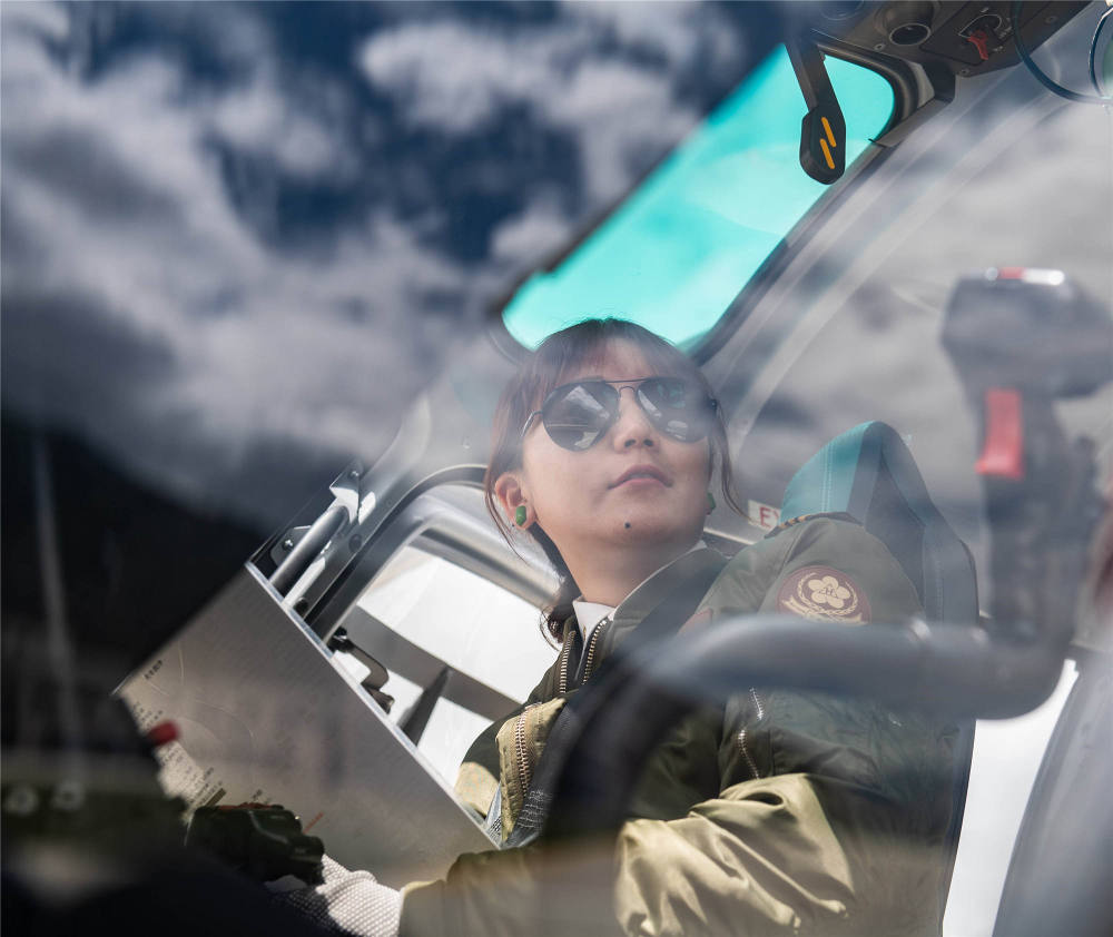 ↑2019年8月7日,西藏拉萨雪鹰通用航空股份有限公司的停机坪上,藏族女飞行员坚热益西在做起飞前的准备。经过刻苦训练,来自西藏当雄县一户贫困牧民家庭的坚热益西成为了一名“飞天仙女”,这改变了她和家庭的命运。新华社记者晋美多吉摄
