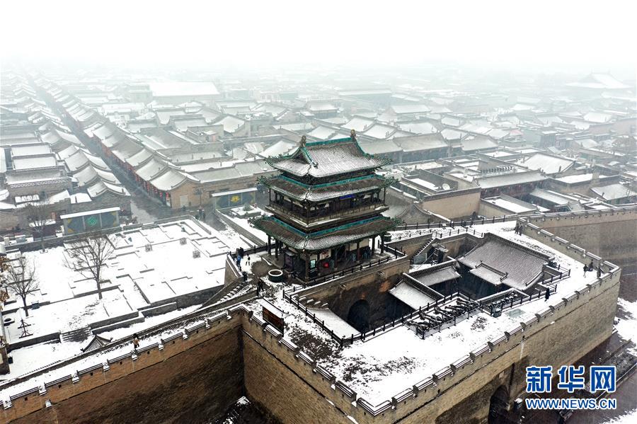 1月5日拍摄的平遥古城迎薰门城楼(无人机照片)。新华社记者 詹彦 摄