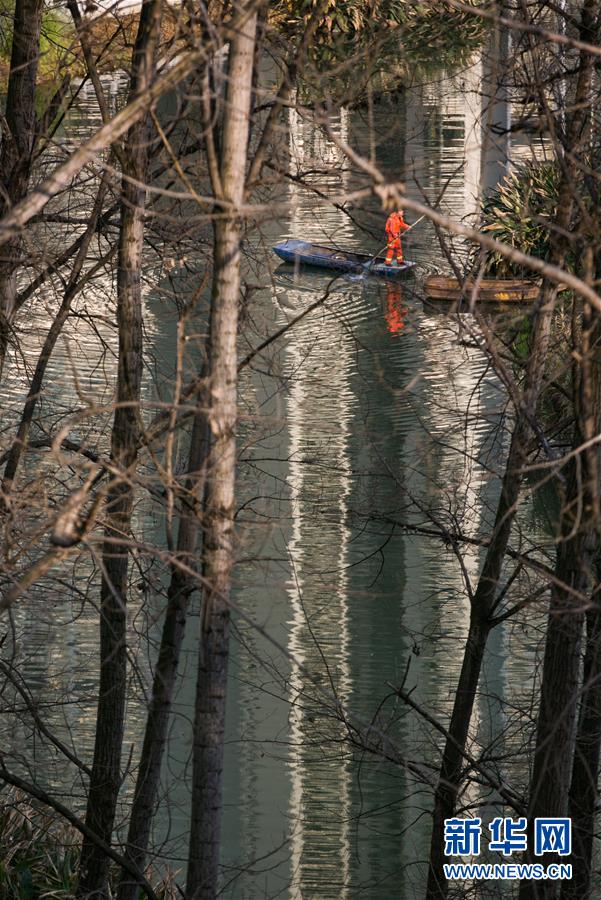 1月5日,河道清洁工在贵州省毕节市七星关区倒天河上打捞河道漂浮物。 新华社发(罗大富 摄)