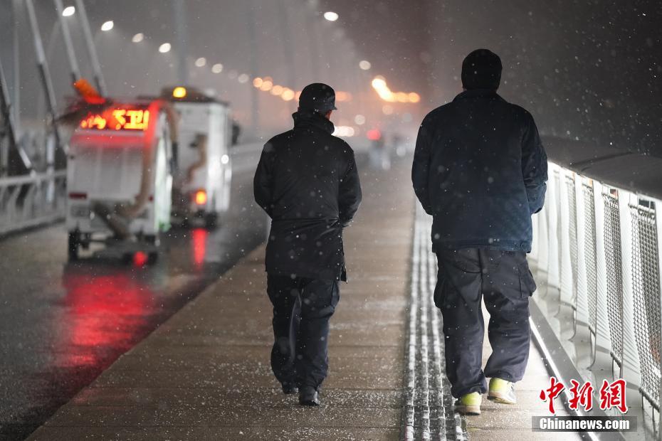 1月5日晚,北京迎来2020年首场降雪,行人在雪中出行。 中新社记者 张兴龙 摄