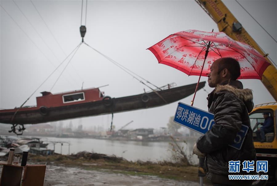 在长江新螺段白鱀豚国家级自然保护区渔船拆解现场,长江捕捞村渔民夏明星注视着被吊起的渔船,他手上的渔船编号牌也即将被收回(2019年12月25日摄)。 新华社记者肖艺九摄