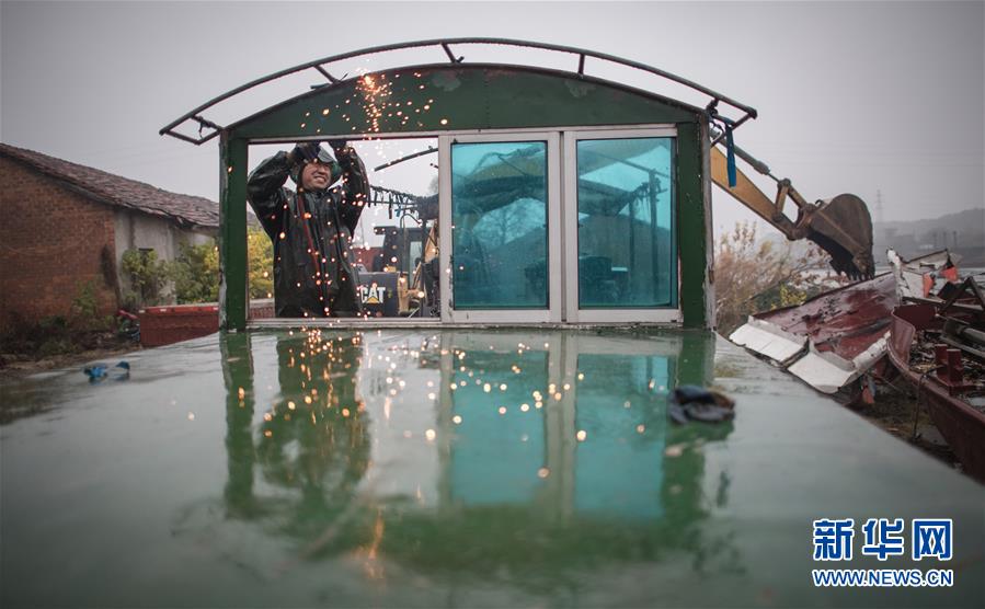 在长江新螺段白鱀豚国家级自然保护区渔船拆解现场,一名渔政工作人员在对一艘渔船进行拆解(2019年12月25日摄)。 新华社记者肖艺九摄
