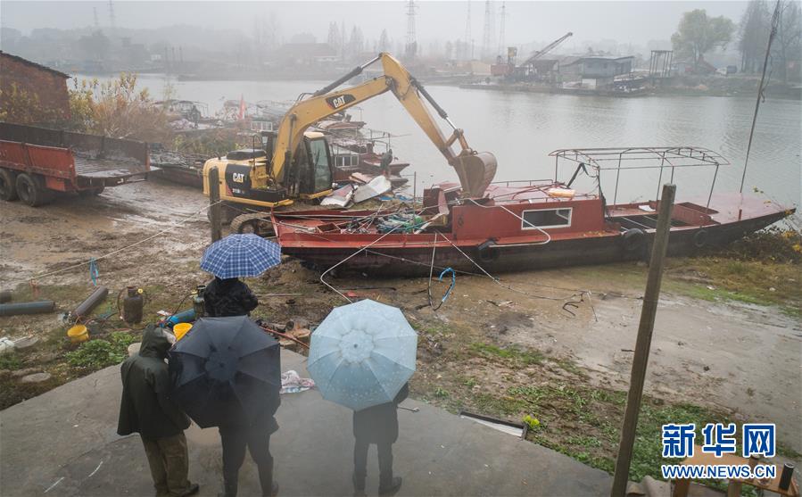 在长江新螺段白鱀豚国家级自然保护区渔船拆解现场,渔民在一旁观看正在被拆解的渔船(2019年12月25日摄)。 新华社记者肖艺九摄