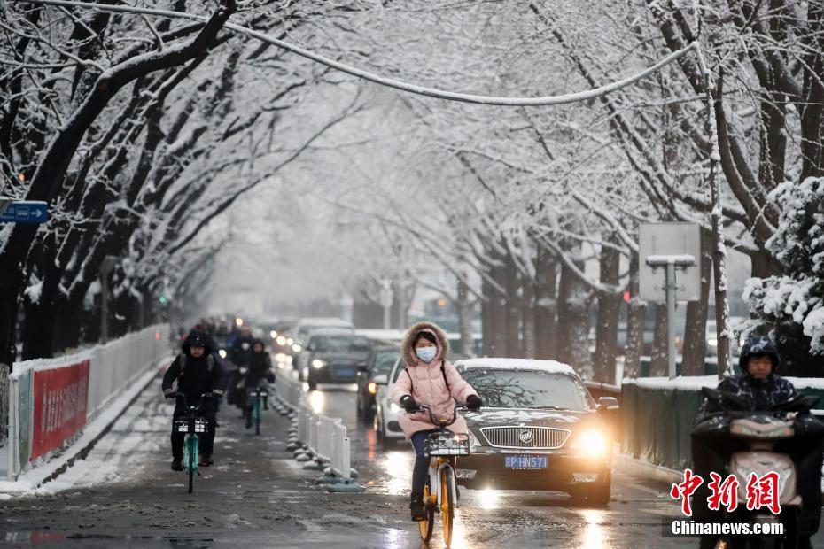 1月6日,北京迎来2020年的第一场雪,市民雪后出行。 中新社记者 盛佳鹏 摄