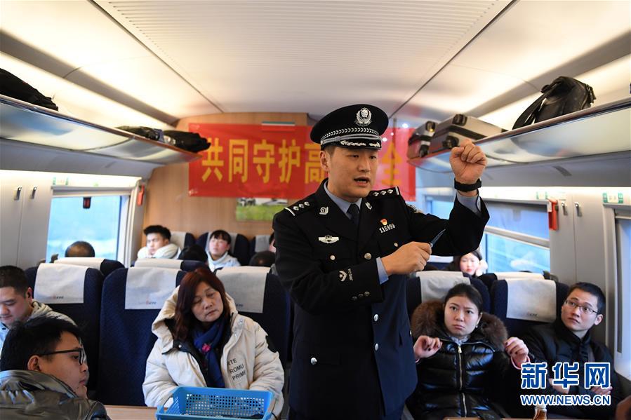 1月6日,重庆铁路公安处民警在高铁列车上向乘客展示乘车违禁物品。 当日,重庆铁路公安处联合重庆客运段动车三队开展春运安全宣传活动,向乘车旅客宣传乘车注意事项、反扒技巧、爱路护路知识,以确保铁路运输的正常秩序和旅客生命财产安全。 新华社记者唐奕摄