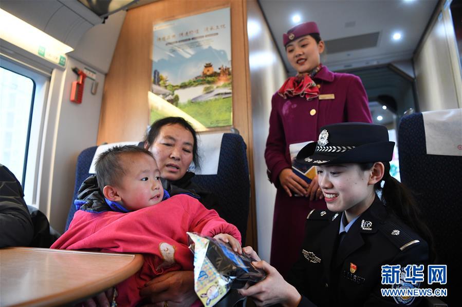 1月6日,铁路工作人员在安全宣传活动中向小乘客赠送纪念品。 当日,重庆铁路公安处联合重庆客运段动车三队开展春运安全宣传活动,向乘车旅客宣传乘车注意事项、反扒技巧、爱路护路知识,以确保铁路运输的正常秩序和旅客生命财产安全。 新华社记者唐奕摄