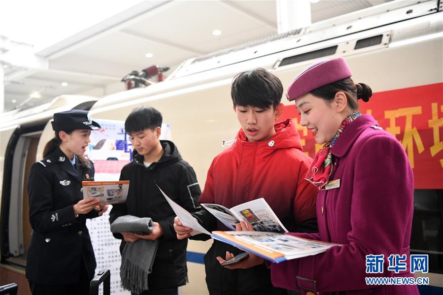 1月6日,铁路工作人员在重庆北站向候车旅客讲解安全乘车知识。 当日,重庆铁路公安处联合重庆客运段动车三队开展春运安全宣传活动,向乘车旅客宣传乘车注意事项、反扒技巧、爱路护路知识,以确保铁路运输的正常秩序和旅客生命财产安全。 新华社记者唐奕摄