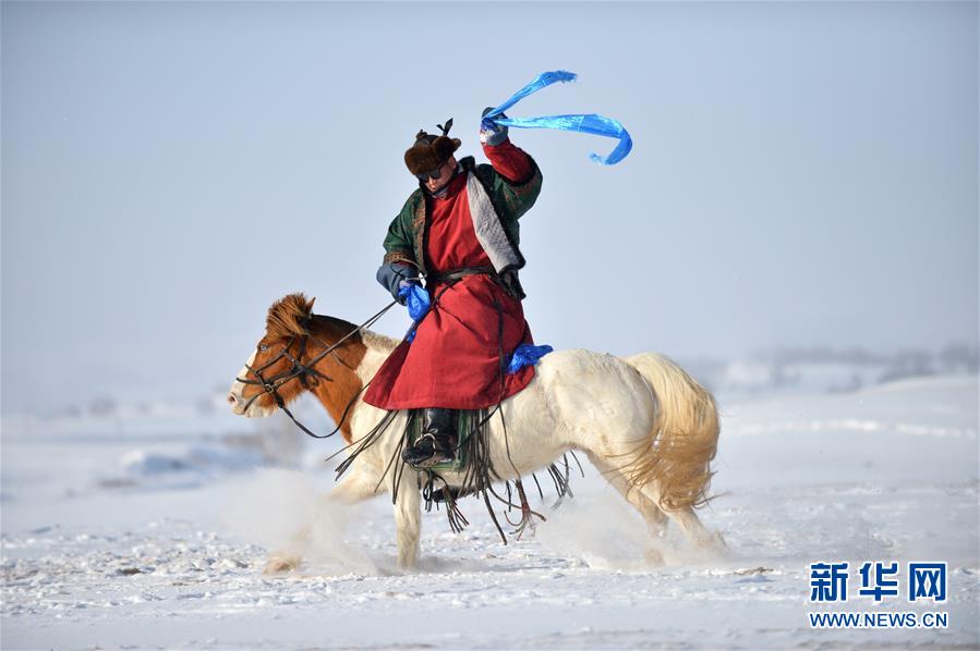 1月6日,演员在乌兰布统草原马文化摄影节上表演骑马拾哈达。 当日,第三届乌兰布统(坝上)草原马文化摄影节在内蒙古克什克腾旗乌兰布统草原开幕,骑马拾哈达、骑马表演、套马表演等具有民族风情的活动吸引众多游客和摄影爱好者前来观赏、拍摄。该摄影节是克什克腾第十三届冬季旅游节活动之一,将持续至1月8日。 新华社记者徐钦摄