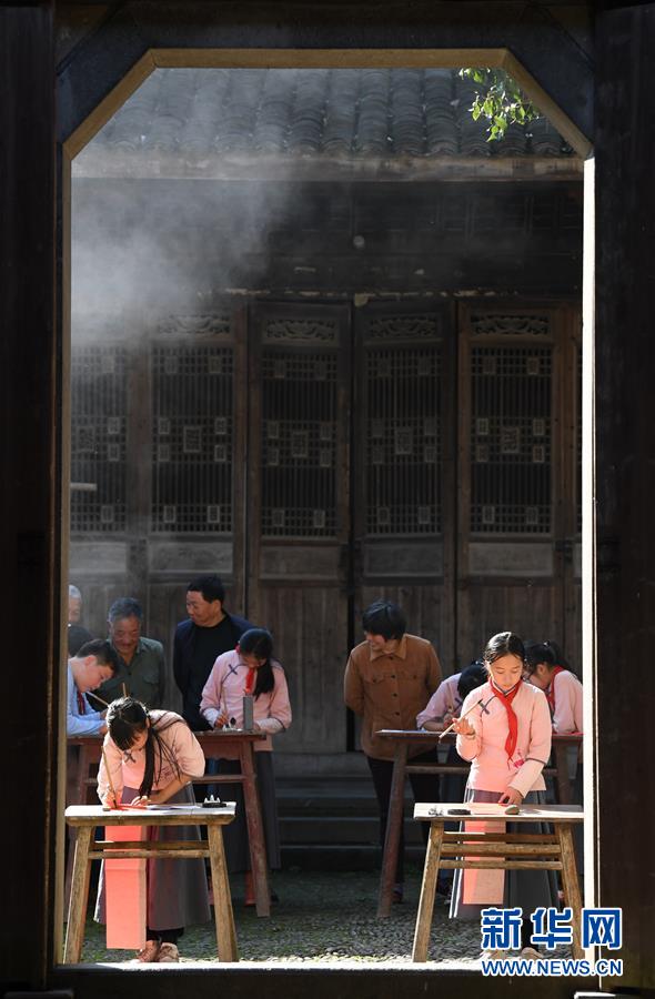 1月7日,在浙江诸暨东白湖镇斯宅村,村民在千柱屋一处天井内观看斯民小学学生写春联。 新华社记者翁忻旸摄