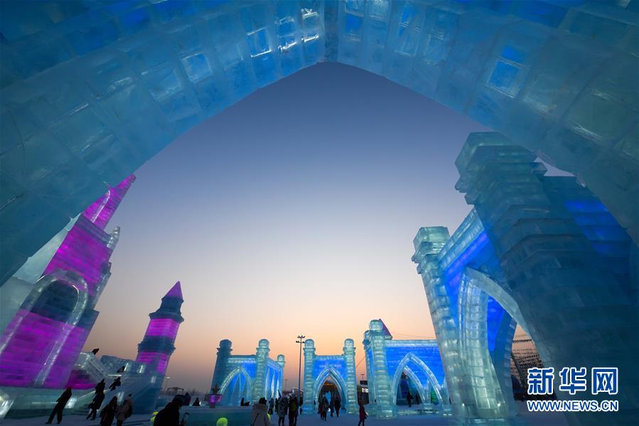 这是哈尔滨冰雪大世界园区中的景观(1月5日摄)。 每到冬季,天气寒冷的冰城哈尔滨陆续迎来各类冰雕雪雕赛事。从2019年12月7日起,采冰工人们日夜采冰运冰、冰景雪雕艺术家精心雕琢,这些“冰雪造梦者”们在严寒天气中辛苦付出,让一座“冰雪之城”在松花江畔拔地而起,向来自世界各地的游客展现浪漫绚丽的冰雪奇观。 新华社记者 王松 摄
