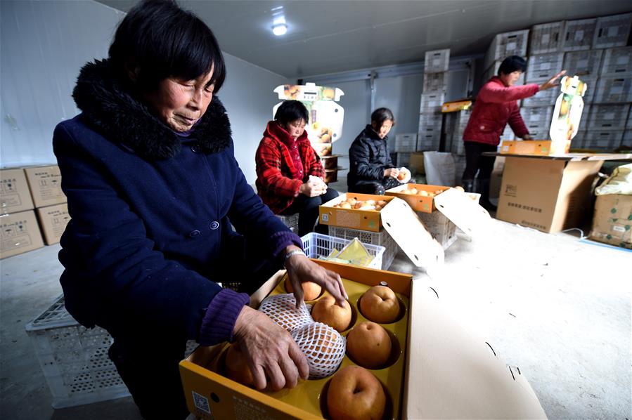 1月8日,安徽省霍邱县村民在包装黄金雪梨。 新华社发(周牧 摄)