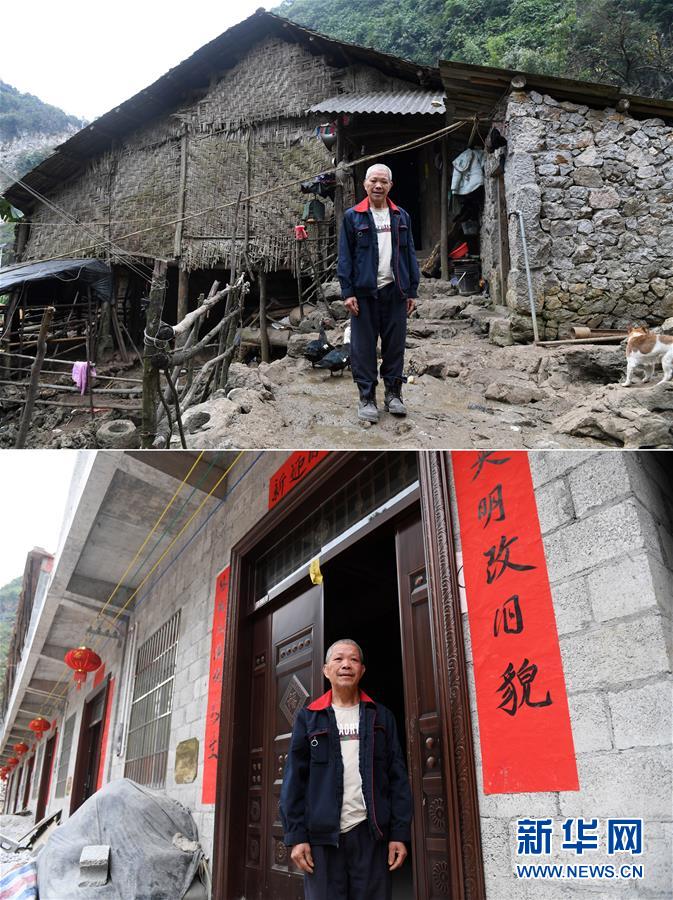 这张拼版照片显示的是:1月8日,在广西都安瑶族自治县龙立屯,村民袁振群站在旧房前(上图);1月8日,村民袁振群站在新居前(下图)。 广西都安县三只羊乡平花村龙立屯是一个深度贫困人口聚居屯,全屯12户村民的房屋主要以木瓦、土坯结构为主,年久失修。2018年12月,当地党委政府对全屯住房进行统一规划和建设,以改善村民居住条件。新春佳节临近,村民陆续搬入新居。 新华社记者 陆波岸 摄