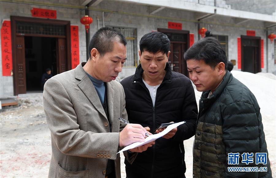 1月8日,在广西都安瑶族自治县龙立屯,驻村第一书记潘照丰(左一)和村民在村民新居前商量后续建设事宜。 广西都安县三只羊乡平花村龙立屯是一个深度贫困人口聚居屯,全屯12户村民的房屋主要以木瓦、土坯结构为主,年久失修。2018年12月,当地党委政府对全屯住房进行统一规划和建设,以改善村民居住条件。新春佳节临近,村民陆续搬入新居。 新华社记者 陆波岸 摄