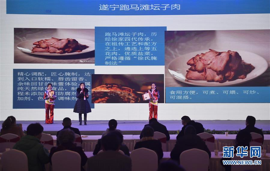 1月8日,参展商在年货节现场推介产品。 当日,在成都举办的第24届四川新春年货购物节上,来自四川各地的扶贫农产品吸引众多市民选购。 新华社记者 刘坤 摄