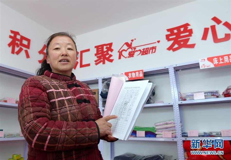 1月7日,河北省张家口市张北县公会镇落花营村“爱心超市”管理员孙秀琴在展示村民用积分兑换生活用品的记录。据了解,该村通过将村民在公益互助、道德建设、孝老爱亲等方面的行动量化为积分,并鼓励村民用积分换取免费生活物品的方式推动对贫困人口“扶志扶智”。 新华社记者 李贺 摄