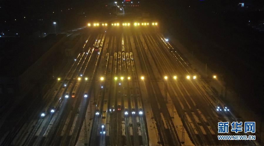 1月8日,在沈阳动车段沈阳北动车运用所存车线,检修整备好的动车组列车整装待发(无人机照片)。 2020年春运临近,中国铁路沈阳局集团有限公司沈阳动车段沈阳北动车运用所加强对动车组列车的检修整备工作,为即将到来的春运做好准备。 新华社记者 杨青 摄