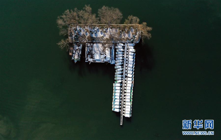 1月8日拍摄的济南大明湖上的游船码头(无人机照片)。 当日,济南雪霁初晴,美不胜收。 新华社记者 朱峥 摄