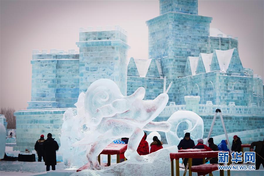 1月8日,哈尔滨国际冰雕比赛参赛选手在创作冰雕。 新华社记者 王松 摄