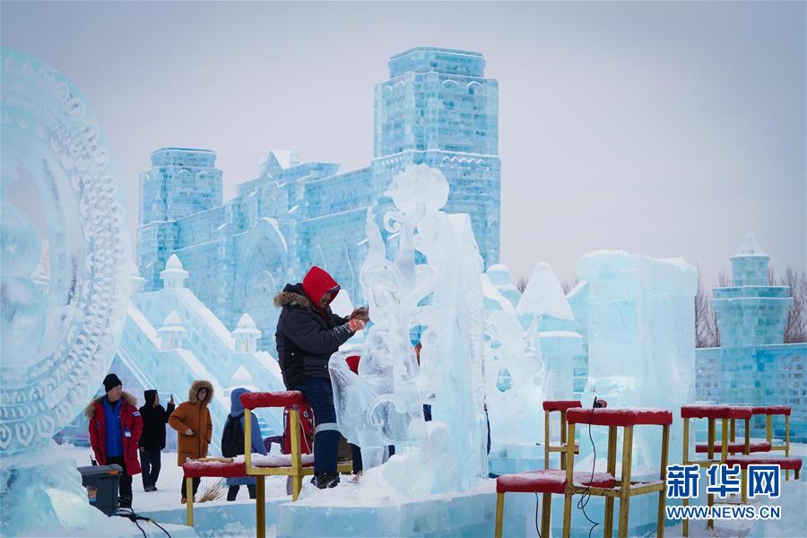 1月8日,哈尔滨国际冰雕比赛参赛选手在创作冰雕。 新华社记者 王松 摄