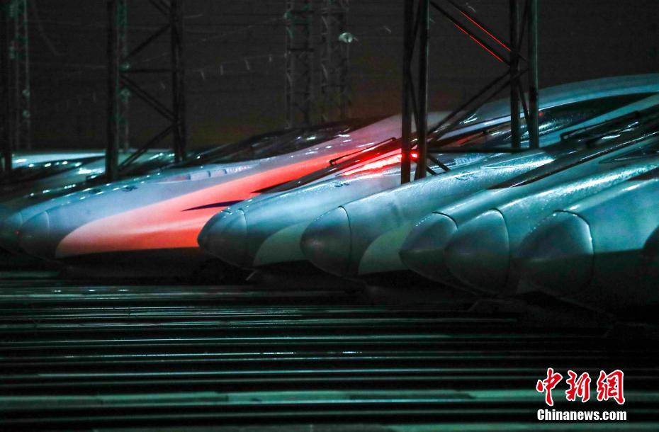 1月9日凌晨,在武汉动车段经过检修、保温作业的动车组蓄势待发,迎接即将开始的2020年春运。中新社记者 张畅 摄