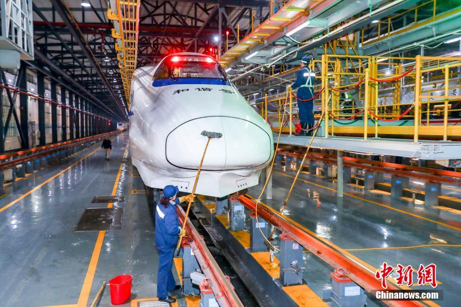 1月8日晚,武汉动车段检修库,工作人员在清洗列车车头。中国铁路武汉局集团有限公司武汉动车段是华中最大的高铁动车检修基地。2020春运临近,该动车段近3000名检修技术人员已全部到位,投入到各项动车检修工作中,以确保春运安全。 中新社记者 张畅 摄