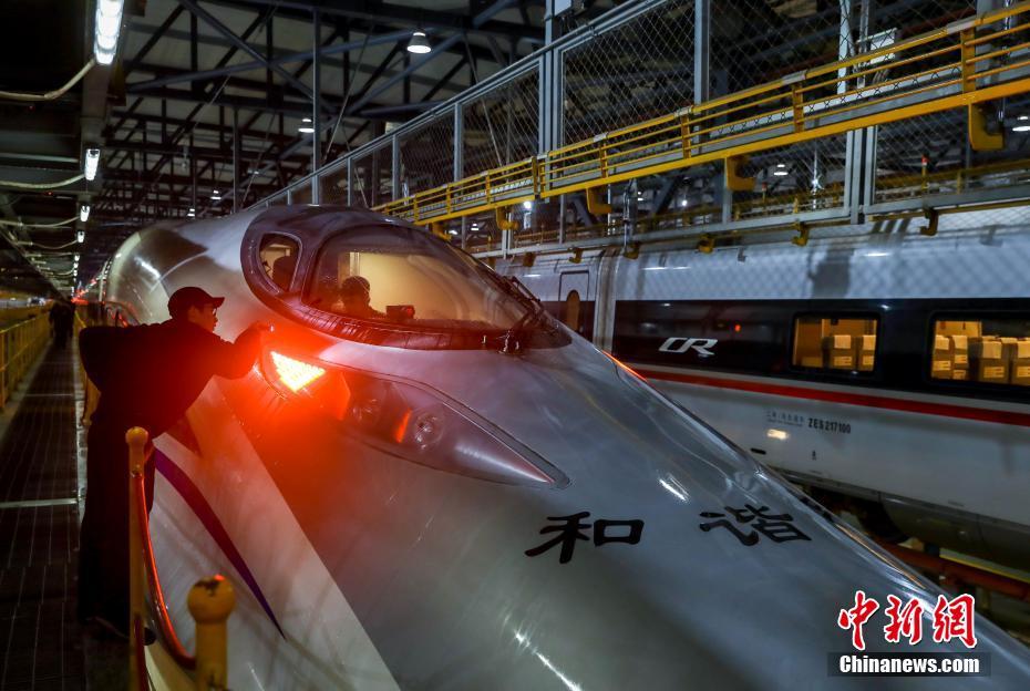 1月9日凌晨,武汉动车段检修库,动车机械师在检修列车中国铁路武汉局集团有限公司武汉动车段是华中最大的高铁动车检修基地。2020春运临近,该动车段近3000名检修技术人员已全部到位,投入到各项动车检修工作中,以确保春运安全。 中新社记者 张畅 摄
