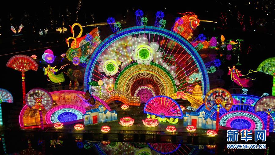 1月8日晚拍摄的南通紫琅灯会花灯(无人机照片)。 春节临近,江苏南京、南通等地华灯璀璨,年味渐浓。 新华社发(许丛军 摄)
