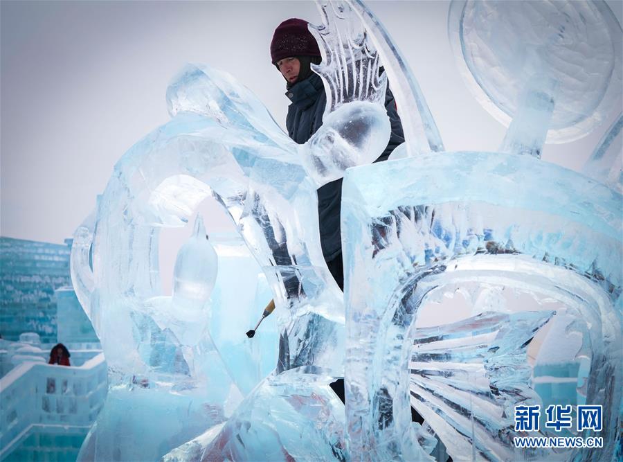冰雕师在哈尔滨冰雪大世界内雕刻冰雕作品(1月8日摄)。 近日,在哈尔滨冰雪大世界园区内举行的各项冰雕赛事中,经过来自世界各地的冰雕选手悉心雕琢,一块块冰变身为精美的艺术作品,数十座冰雕仿佛晶莹剔透的出“冰”芙蓉。 新华社记者 王松 摄