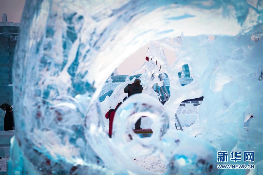 冰雕师在哈尔滨冰雪大世界内雕刻出主题各异的冰雕作品(1月8日摄)。 近日,在哈尔滨冰雪大世界园区内举行的各项冰雕赛事中,经过来自世界各地的冰雕选手悉心雕琢,一块块冰变身为精美的艺术作品,数十座冰雕仿佛晶莹剔透的出“冰”芙蓉。 新华社记者 王松 摄