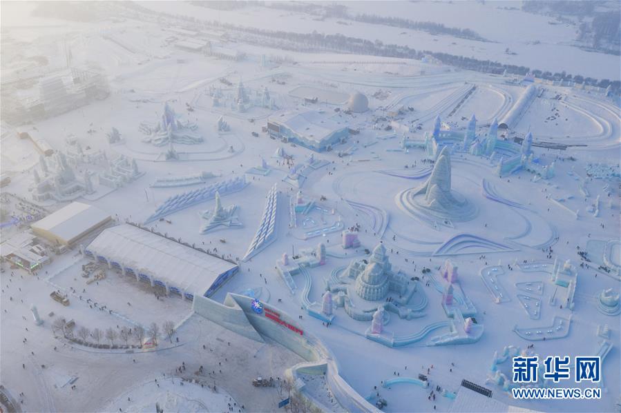 这是第二十一届哈尔滨冰雪大世界园区(无人机照片,2019年12月23日摄)。 进入冬季以来,“冰城”哈尔滨换上“冰雪新装”,向来自世界各地的游客展现浪漫绚丽的冰雪奇观。 新华社发(谢剑飞 摄)
