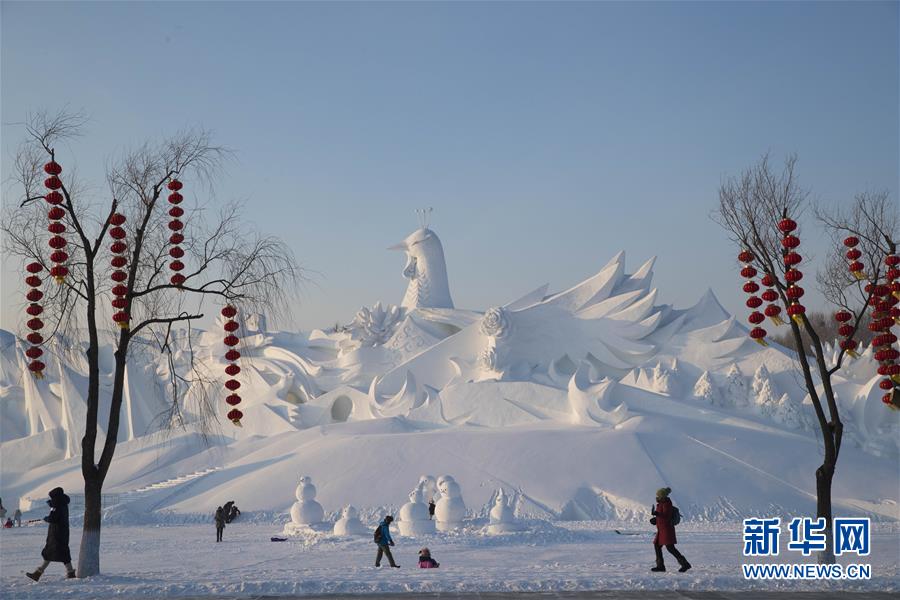 游人在哈尔滨太阳岛雪博会游览(2020年1月3日摄)。 进入冬季以来,“冰城”哈尔滨换上“冰雪新装”,向来自世界各地的游客展现浪漫绚丽的冰雪奇观。 新华社发(张涛 摄)