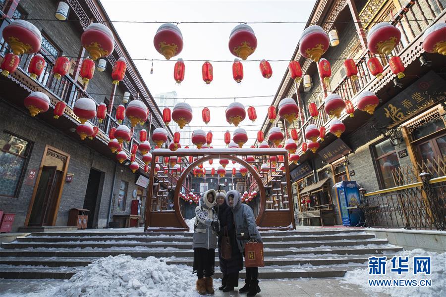 游人在哈尔滨市道外区中华巴洛克历史文化街区拍照(2019年12月31日摄)。 进入冬季以来,“冰城”哈尔滨换上“冰雪新装”,向来自世界各地的游客展现浪漫绚丽的冰雪奇观。 新华社发(张涛 摄)