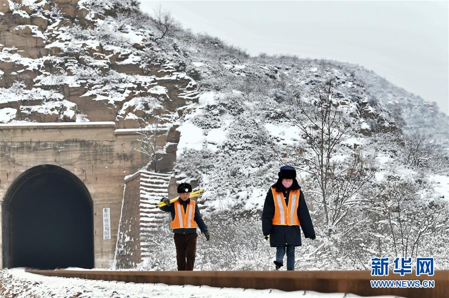 1月8日,千福旺(左)、王新灵夫妻走在线路上。 新华社记者 曹阳 摄