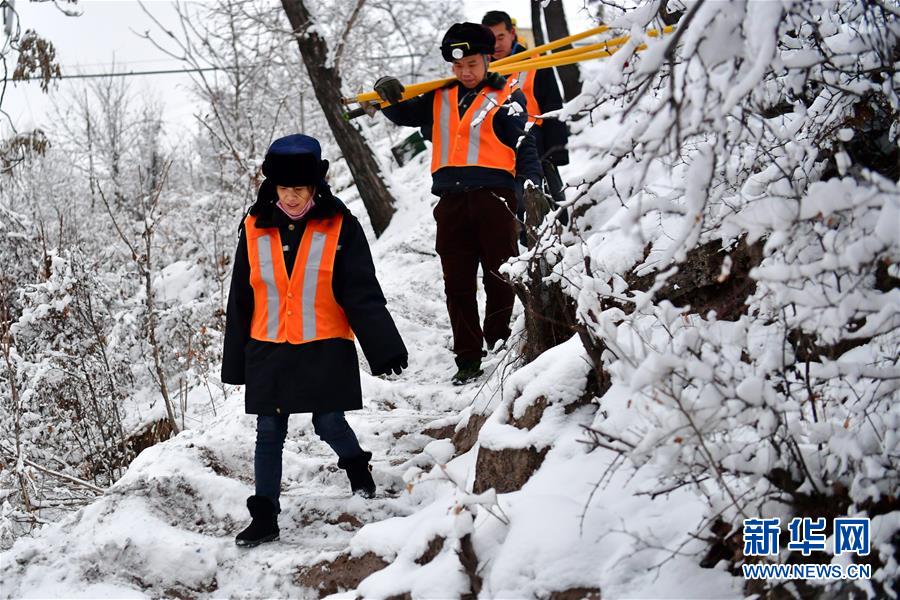 1月8日,千福旺(中)、王新灵(左)夫妻和工友走在去结冰点的路上。 新华社记者 曹阳 摄